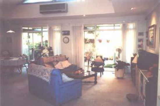 The living area opens out to a delightful private courtyard and garden with a water feature. The home is on three levels, with two sets of stairs, each with half a dozen treads. The main bedroom has an en suite and air conditioning. The large living area has high vaulted ceilings and air conditioning.