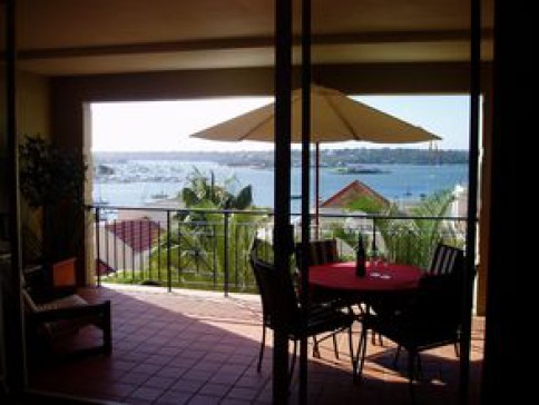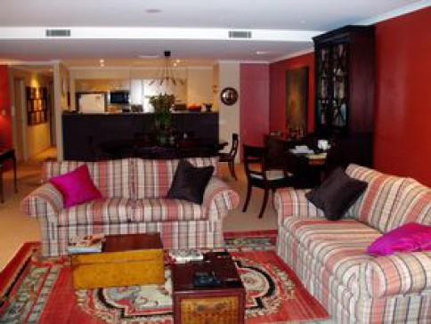 Apartment features two bedrooms, main with Queen size bed, dressing area and en suite incl spa bath, guest room with double bed; separate bathroom; 6x9m living/dining room opening to a large private north-facing balcony; kitchen with European appliances; internal laundry; study; double garage with lift access. Aircon/heating, LCD TV, DVD, video, quality hi-fi, internet. Landscaped community gardens, heated outdoor pools, spa, sauna, gym.