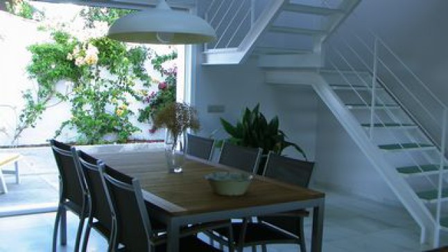 Modern, spacious, extremely light and comfortable 2-floor townhouse. Ground floor open plan kitchen/dining room opens on to equally light south-facing garden, grasses, jasmine, rose and honeysuckle planting and 2 double bedrooms. Main bedroom on the first floor plus sitting-room and a great terrace facing the sea. Double-glazing throughout and flat screen TV, music system, etc).