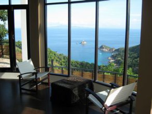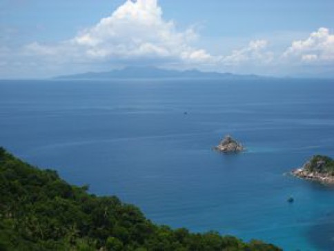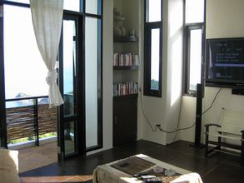 A purpose built modern villa situated cliff-top with 'the best view in the Gulf of Thailand', offering +180 degree view from its 200m high eagle's nest location. 2 bedrooms, 2 bathr'ms (1 ensuite), kitchen, mezzanine reading area, lounge, entrance hall, 2 sun decks, 2 basement storage areas and TV sala (3rd bedroom). Main building is a circular design, external walls mostly comprised of glass to max'ise the panoramic impact. With a pool and seperate hot water cliff-top bath, this is a big villa. Inc'50" flat-screen with home theatre system, satTV and PS2. Mas'bed'inc 32" flat-screen and large private balcony. All this on the idyllic tropical island of Koh Tao and its crystal waters! NB dangerous for small children, sheer s!