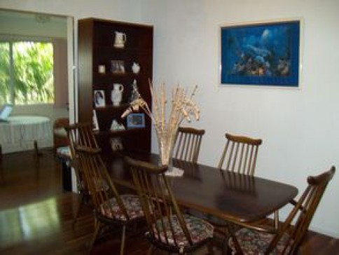 The house is a roomy 1950s high-set Queenslander with parking for a single vehicle underneath. Overlooking the shopping centres, it is set back one street from the main road on the lower slopes of Mount Gravatt. The garden is low maintenance because of the water restrictions.