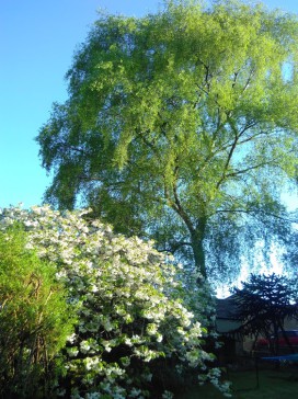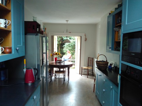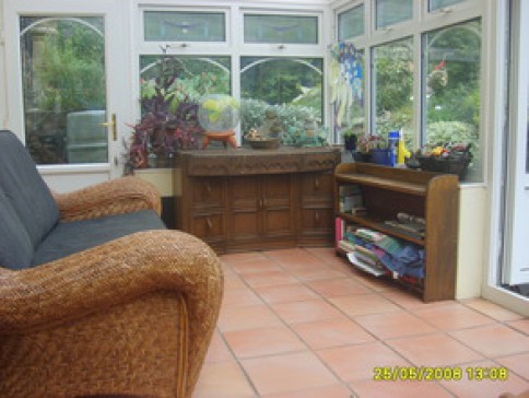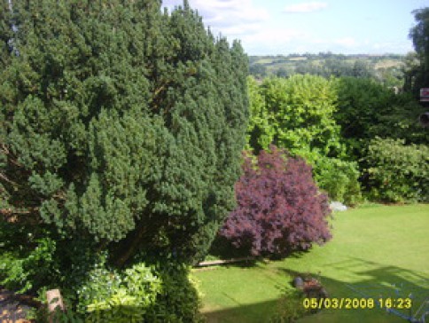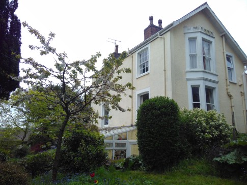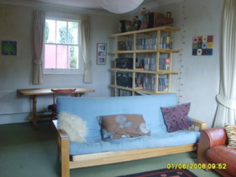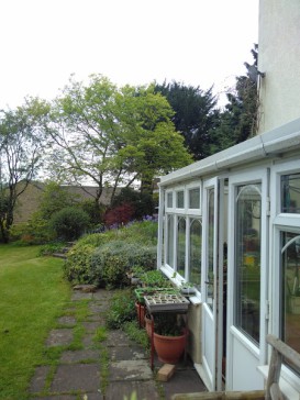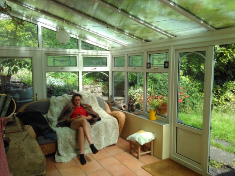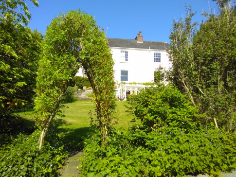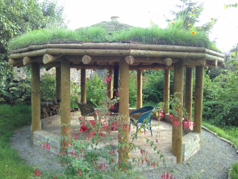 Large secluded garden with sunny terraces, gently sloping lawn, pond and grass roofed roundhouse. Very quiet.