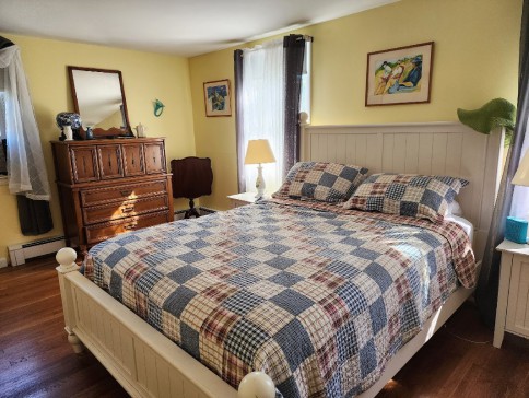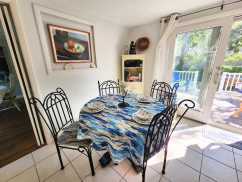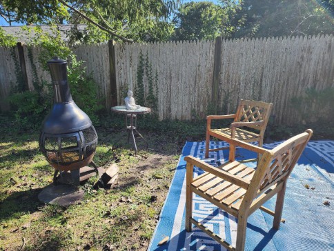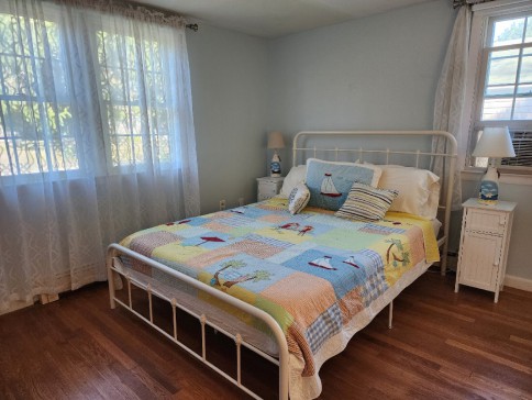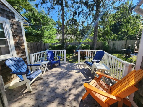 The house has 2 bedrooms and a den room. It will sleep 6 people. Two bedrooms each have a queen size bed. The den has a sofa bed and a single bed. They’re is also a travel crib available. . There is a living room, dining room and kitchen. The deck is off the kitchen for al fresco eating. There is a gas grill in the back garden with picnic tables. The backyard has comfortable outdoor seating.