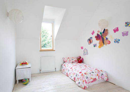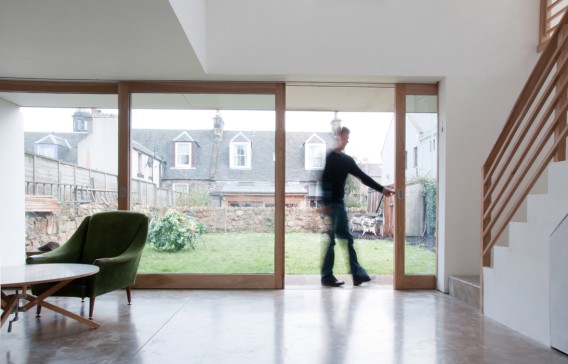 Award winning, architect designed house with garden in Edinburgh. Minimal, open plan space with polished concrete floor and wood burning stove. 3 beds upstairs one with loft sleeping area and study downstairs.