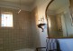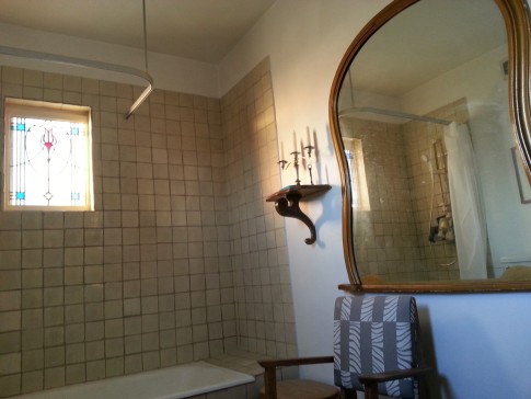 The main bathroom is spacious, with a Victorian stained glass window and views over the river)