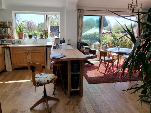 In the entrance hall there is a Bechstein piano. Our light filled 24ft wide kitchen diner has vintage furniture and lamps and wide sliding glass doors opening onto the patio dining area and large garden.