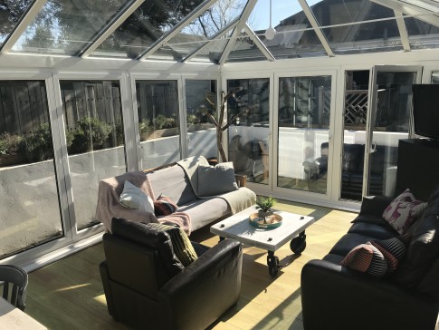 We have two double bedrooms with king size beds and a good sized children`s bedroom. There is a family bathroom. Downstairs we have a living and dining area with sofa and chair and table for 4 we also have a huge conservatory offering 3 sofas one a double sofa bed and table to accommodate 6. A downstairs cloakroom and study/office to the front of our home. Our kitchen has a new range cooker with a table for two leading out onto the decked garden area perfect for summer living.