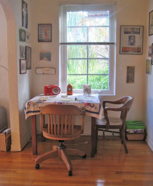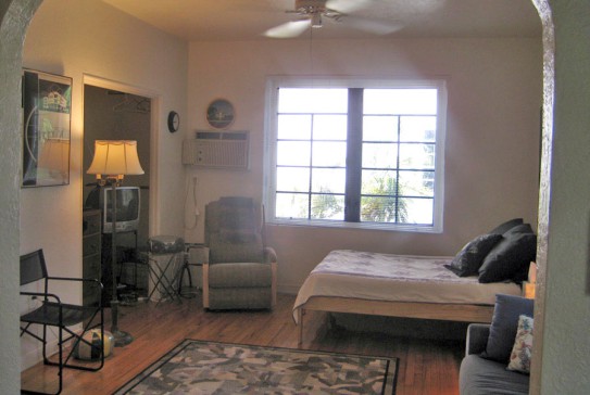 The apartment is a studio, up one flight of stairs. It is bright, airy, and air conditioned. There are laundry facilities for the residents.