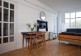 There is a sun-filled balcony with a table and two chairs overlooking a park with a lovely view of the City skyline. A separate kitchen is small but well-equipped, with an electric hob, grill and oven, microwave, washing machine and tumble dryer, and a range of kitchen equipment. The bathroom is full of original features, including an old-fashioned mirrored alcove and a (recently restored) 1930s bath, with a shower. Fresh linen and towels are provided, and there is a fast wireless internet connection. There is also a TV.