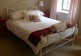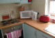 The cute bespoke kitchen is fully equipped - its cupboards painted in an attractive pale turquoise. The bedroom is spacious and boasts a cast iron bed and painted furniture with room for a child on a put-me -up bed. The modern bathroom, with shower over bath is en-suite.