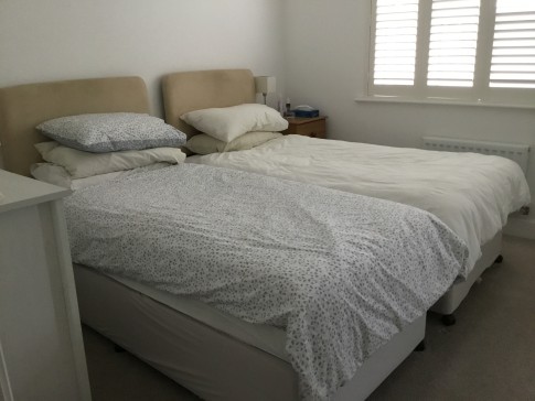 This comfortable house has two double bedrooms, one with an en suite shower room, plus one smaller bedroom, which used as a study, and a family bathroom. The kitchen, which has gas hob, electric oven, dishwasher, washing machine and microwave, has a dining area, with doors to the fully-enclosed garden. The separate sitting room has the TV, and the upstairs study has a PC (wi-fi). There is space in front of the garage to park two cars.