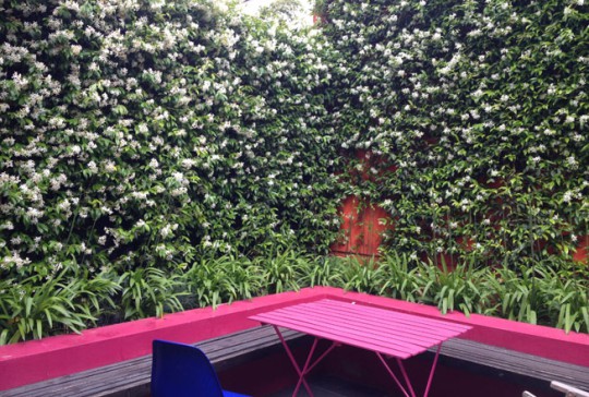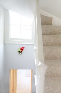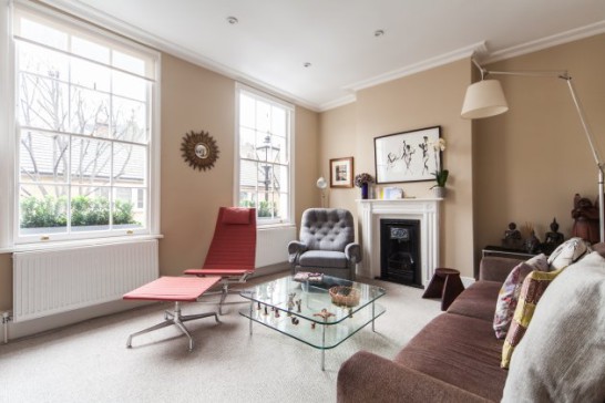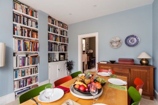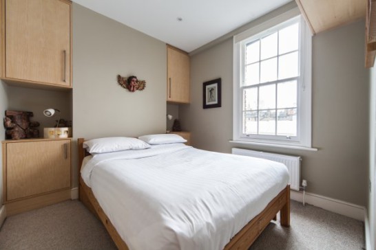 On the ground floor, with a large street-facing window, the dining room doubles as a library with international cookbooks and travel tomes, and an unusual Dia de Muertos skull also has a place on the shelves. The adjacent sitting room is cosy, with a low-slung, red sofa and underfloor heating, and the sleek galley kitchen on this floor leads out to the back garden for convenient al fresco dining at the pink dining set. Inside, and up one flight of stairs, there’s an office, a bathroom, and a sitting room brightened by a sunburst mirror and Latin American art. Two bedrooms are mild in contrast, and span the top floor: the double has a view of the garden while the master looks over the street. And the worldly street food of Exmouth Market is a five-minute walk away should you seek more spice.