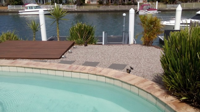 Outside area has an in ground saltwater swimming pool and a private walk ramp down to a pontoon.
