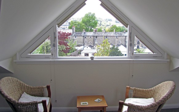 Downstairs is a dining room, lounge with wood burner and kitchen diner. Upstairs are three bedrooms (2 double/1 single) and a bathroom. The third large attic bedroom includes a nice picture window with views across the town and into the fells. (Please note the double in the loft room has a low bed under the eaves).