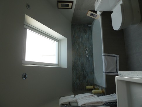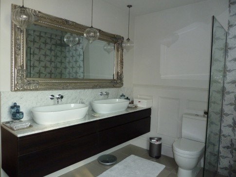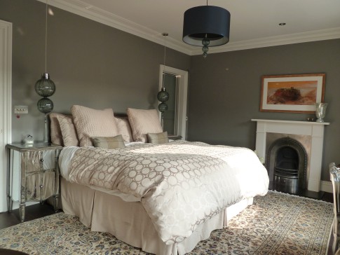 Walking through a landing with a glass balustrade that overlooks the glass dining room, you will find what we like to call "The Hotel Room". This large double bedroom is entirely self sufficient with it's own bathroom and beautiful fitted wardrobes.