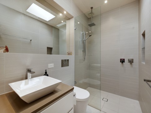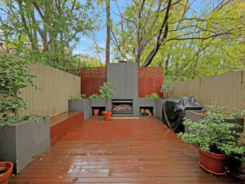 On the first floor level at the rear is a guest bedroom with double bed, full bathroom (including bath) and a study alcove with desk and printer. The main bedroom, with queen bed and ensuite bathroom, leads onto a sunny private deck overlooking the street - perfect for breakfast or an evening drink.