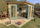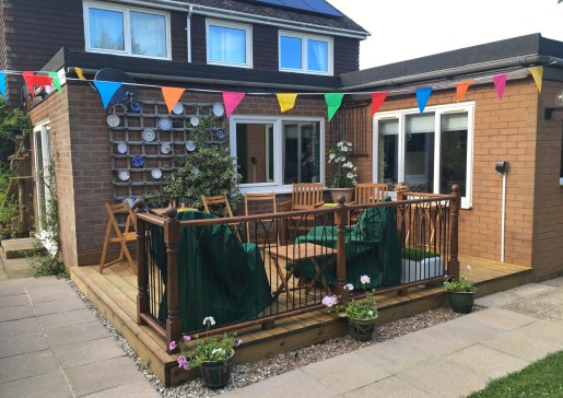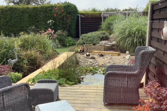 Outside we have a very private enclosed garden with a kitchen patio, a terrace (sliding door from dining room) and a deck overlooking the pond (sliding door from study). We have two further decked areas and a summer house to catch the morning sun.