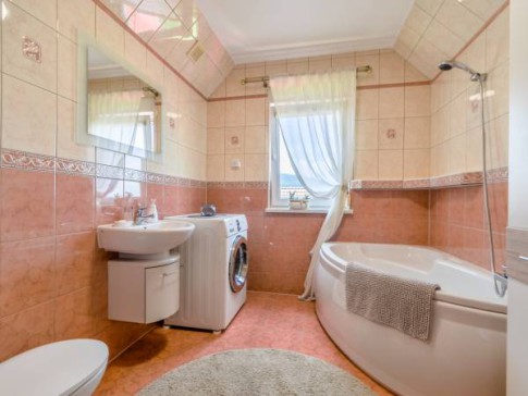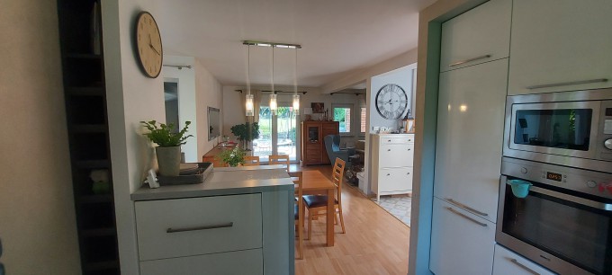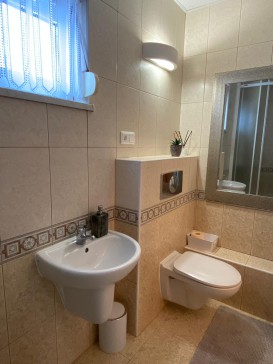 It is a single-family open-space house. On the ground floor there is a modern white kitchen linked to the dining room and a living room with a fire place. There is also a spacious room built as an extension to the house with direct entry to the roofed tarrace. There ia also a small hall with a fitted wardrobe and a bathroom with a shower on the ground floor.