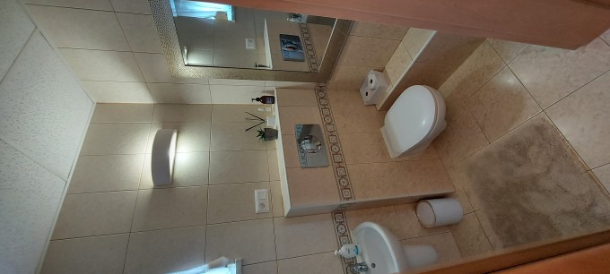 On the first floor there are 3 bedrooms with a master bedroom containing a huge walk-in wardrobe and an entrance to a huge balcony with views to the mountains. There is also a bathroom with a big bath and a wasching machine.