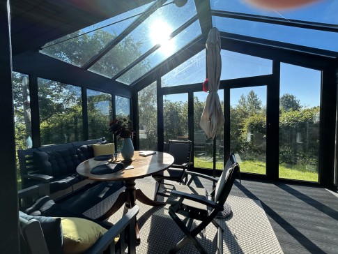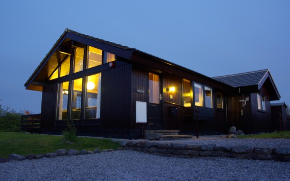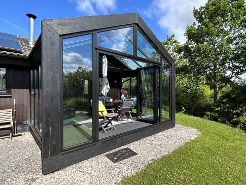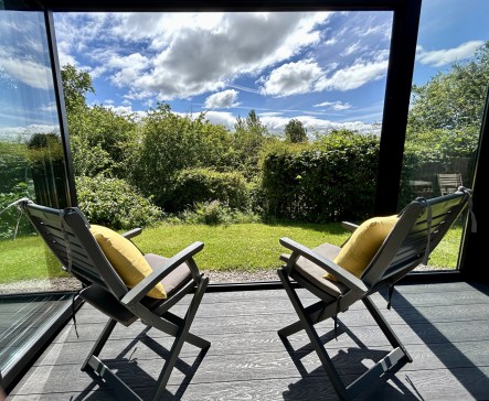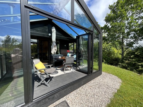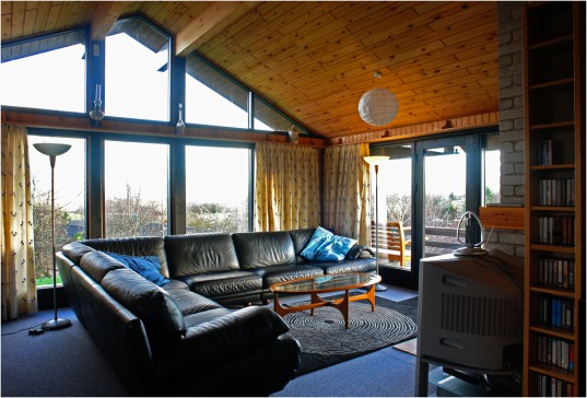 The building itself is of genuine Scandinavian construction, built by a Danish contractor in the late 1980s, and this can be seen in the high quality of the finish. The living/dining/kitchen area is open plan and features large glazed windows under an over-sailing roof, together with a wood burning stove. Furniture and fittings have been selected with the simplicity of Scandinavian design in mind and are of a high quality modern style. The lounge area features a huge “L” shaped Italian leather sofa which can seat 8 people comfortably. There is a wide screen Sony digital TV, DVD, video, stereo/radio and i-pod station, together with numerous books and board games to keep you entertained. The spacious kitchen area includes a full sized dishwasher, cooker with induction hob, microwave and fridge with freezer compartment . There are 3 bedrooms: a double, a twin and a small room with bunk beds. 2 have fitted wardrobes. There is also a newly built designer conservatory for times when the weather is just a bit too chilly to sit outside. In the summer, bi-folding doors allow the conservatory to be opened up to the garden.