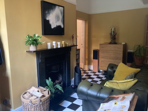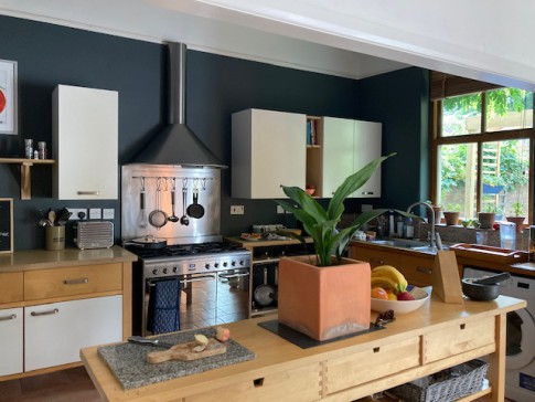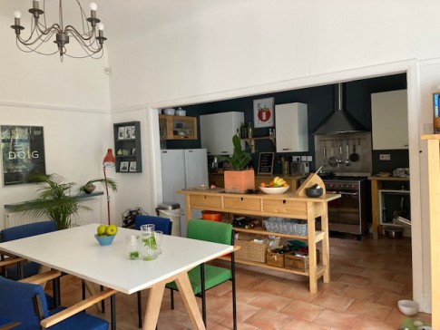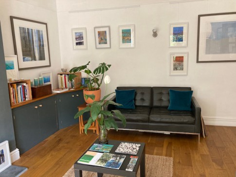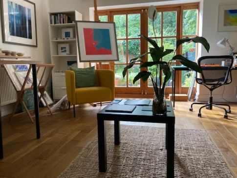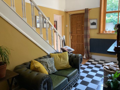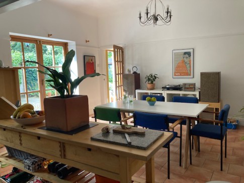 The interior is contemporary scandi/modern. It has a large kitchen/dining space (inc woodburner) and views to the garden. We have an art studio workspace that also looks on to the garden and doubles as a sitting/reading room (with wood-burner). There is also a hall with sofa .
