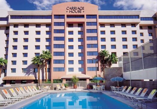 From their website: "Tucked away between the MGM Grand and Planet Hollywood, The Carriage House is the ideal Las Vegas hotel off the “Strip”. Enjoy comfortable accommodations, convenient in-room features and amenities including complimentary Wi-Fi and parking, an outdoor heated pool, a fitness room and no resort fees."