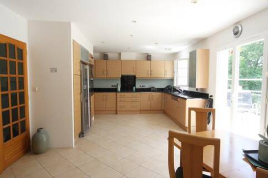 From the sitting room a second pair of glazed doors opens to a very spacious kitchen / dining room (26m2) with tiled floor, a range of modern fitted units and plenty of space for a large dining table. There are glazed doors to the raised terrace / balcony as well as a pair of doors opening back into the entrance hall.