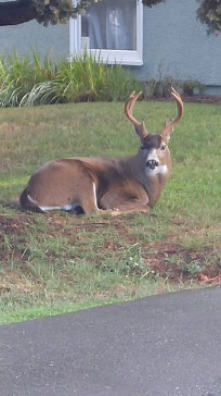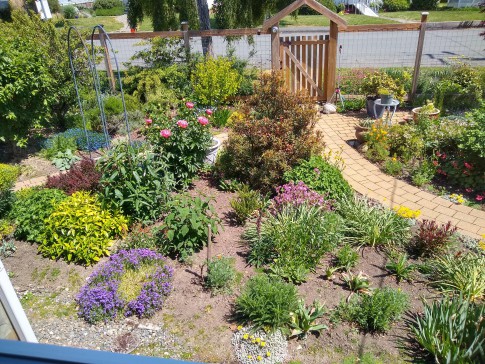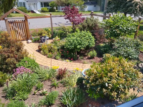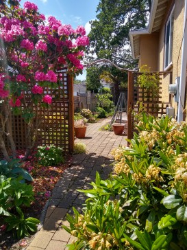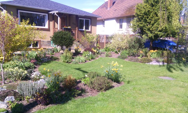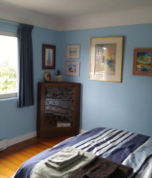 With Victoria's mild climate (nothing like the rest of Canada!) you'll find our house bright, cheerful and warm in the winter, and almost never overwarm in summer. The main floor has glowing Douglas fir flooring throughout and includes a well-designed updated kitchen with table and stools for two, a separate dining room as well as bedroom, bathroom (sink, toilet, underfloor heating and walk-in shower) and living room. The kitchen door opens to a two-level deck overlooking our fenced back garden, full of flowers, shrubs and vegetables; other outdoor seating areas let you follow the sun around or find a nice shady spot to rest. While our house is ideal for the two of us, we can put a queen-sized air bed in the large carpeted music room downstairs to provide additional sleeping accommodation if needed. The second bathroom (sink, toilet and walk-in shower), kitchen area and laundry are also downstairs. The front garden is now fenced to keep out the urban deer - they're lovely to look at, but with this mesh fence you can admire them without any concerns and they can't damage our garden!
