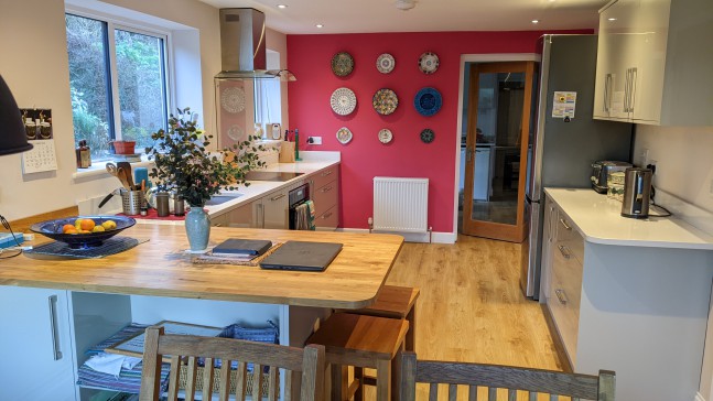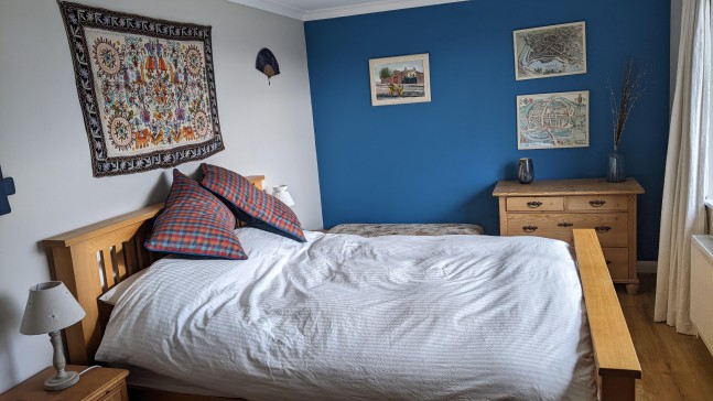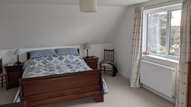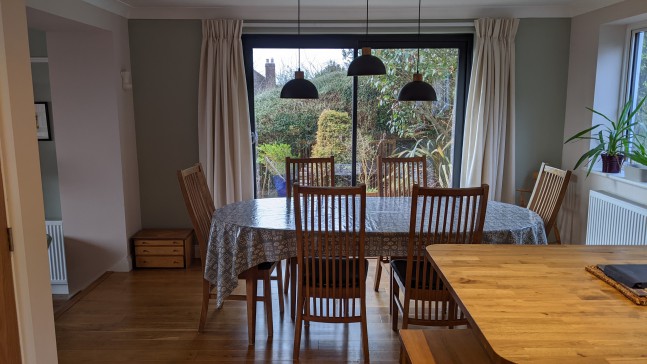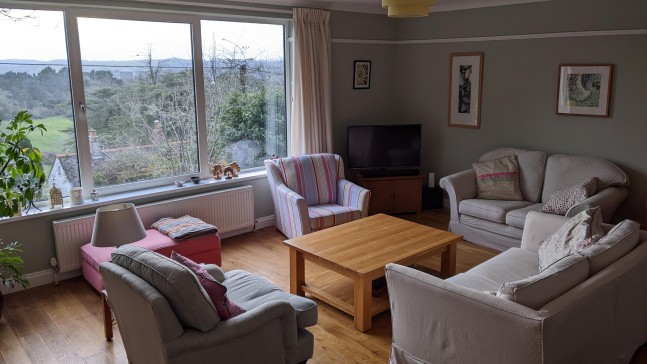 With stunning views over Exeter and surrounding hills and countryside, this detached house is newly renovated and very comfortable. We live on a private road on the very fringes of the city, with fields around us and a nature-reserve opposite the house. It's up on a slope (so there are steps to the front door, with sturdy handrails) with an established garden all around. Roe deer and badgers are regular visitors. The garden is safe for children with supervision. The main living area is open plan. There is a shower-room and 2 bedrooms on the ground floor, and 2 more with bath/shower room on the first floor. 1 bedroom has single bed and cot. The others are 1 double and 2 kingsize beds. The house has PV cells and an air-source heatpump, and the secure garage has a hook up for charging an electric vehicle. The house sleeps 7 adults, and there is a cot, with space for an airbed too.