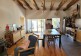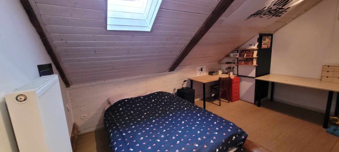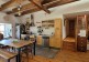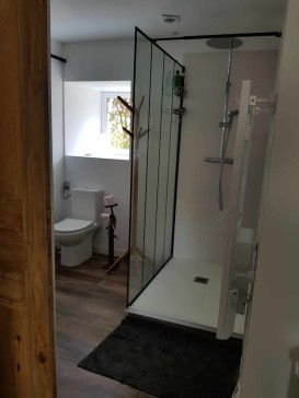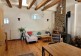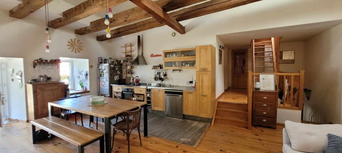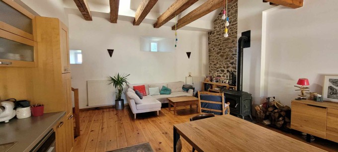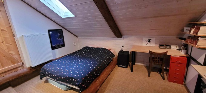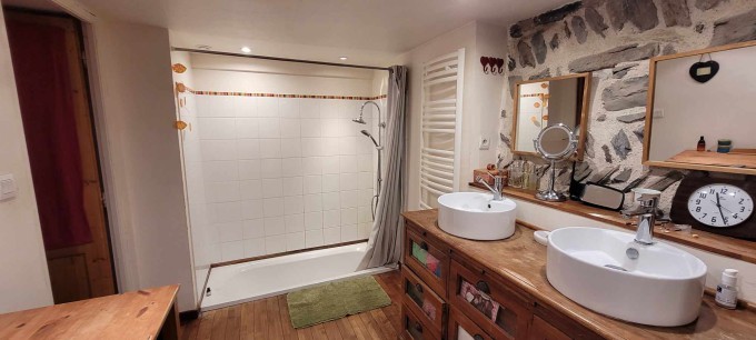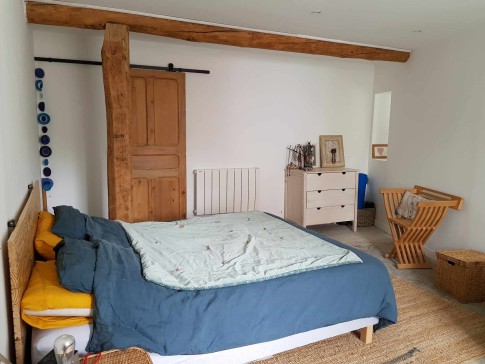 The main room (which was the old barn) is a large and very high ceiling room with the kitchen, the dinning area, a wood stove and a sofa. There are 4 bedrooms, each with a double bed. One of the bedroom is an independant master suite with a private bathroom. There is another bathroom with a bath and 2 sinks.