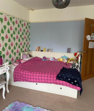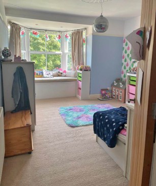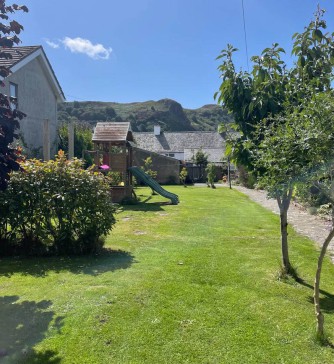 The garden is very large fully enclosed with a decked area next to the house and large lawn with play equipment including gym bars, swings, slides. There is a garage with ample storage.