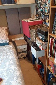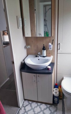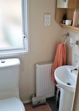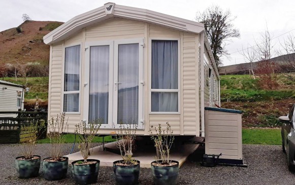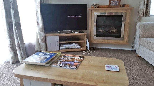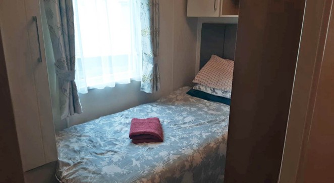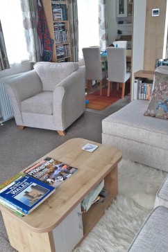 Lovely static caravan with private garden, with very pleasant views all around. Entrance is into the kitchen diner. There is a freezer, fridge, washing machine, dish washer, microwave. I use the Ninja airfryer 11-in-1 as the main cooking source, as it is a marvel of technology!! (Although an oven and gas hobs are available.) Dining table seating four. Comfortable arm chair and roomy sofa, part of which can pull out into a bed settee. Coffee table, TV with TV aerial, blueray player, Apple TV box for catch-up TV. Plenty of DVDs. Central heating. Single bedroom with full size single bed, comfortable mattress, small wardrobe, drawers. Family shower room with toilet and sink. Main bedroom with comfortable king size bed. Ensuite toilet and sink. There is wifi on the site.