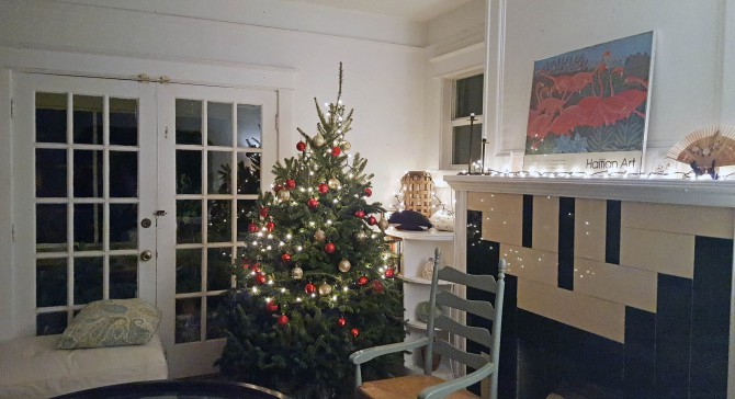 French doors open from living room onto a deep, covered front porch running the full width of the house. It's a great place to sit & catch the prevailing breezes off Biscayne Bay & enjoy the birds in the huge old live oak tree that shades the house.