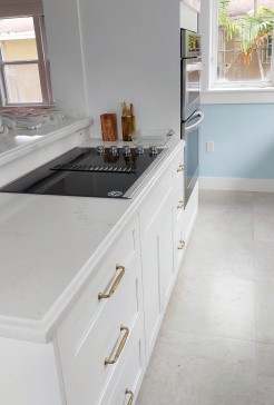 The renovation includes an entirely new kitchen, half bath, and den downstairs & new shower bath upstairs. There is a driveway for off-street parking, including a covered portico section which is an extension of the front porch.