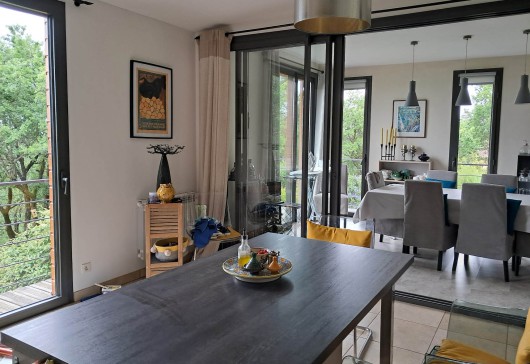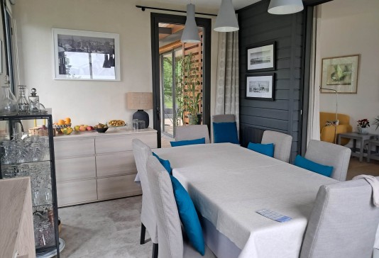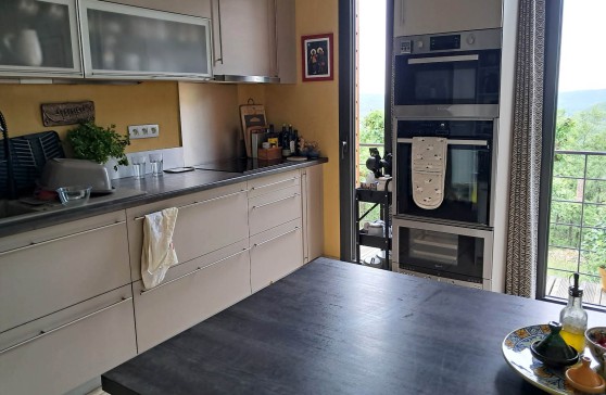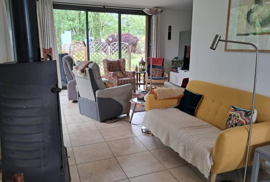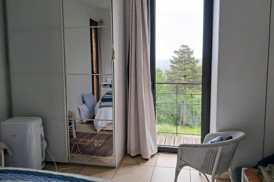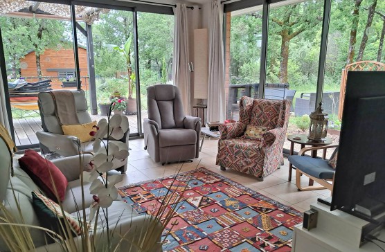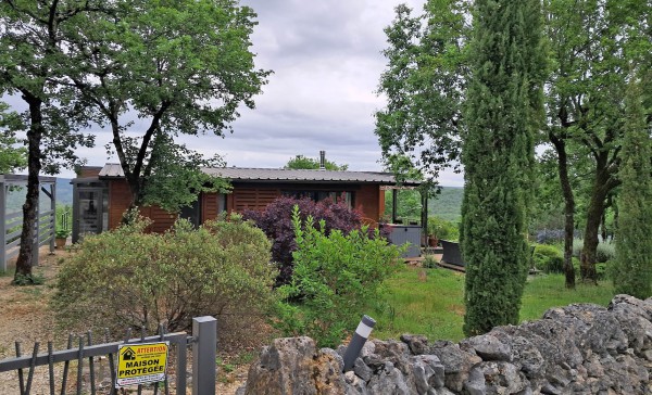 Our home was built 12 years ago by it`s original owners for it`s incredible position and magnificent views over the Lot valley. It is a modern one level wooden and glass structure, full of light. It is airy and cool during the summer months and well insulated and cozy during the winter as we have a large wood burning stove in the living room which heats the house. There is additional heating if needed.