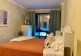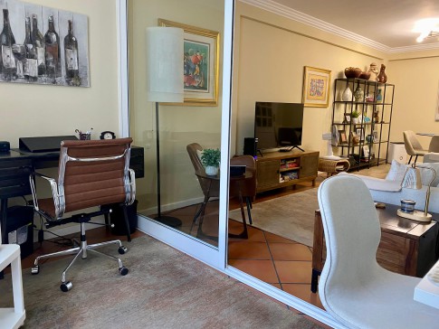 The apartment includes a small office with two desk areas, a nicely appointed dining area and living room space.