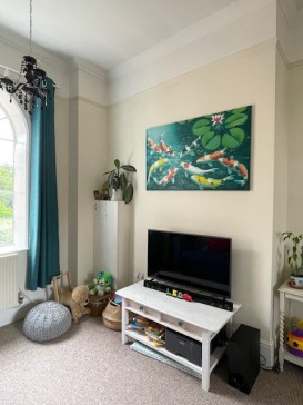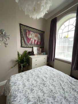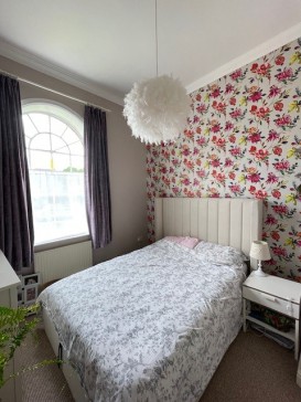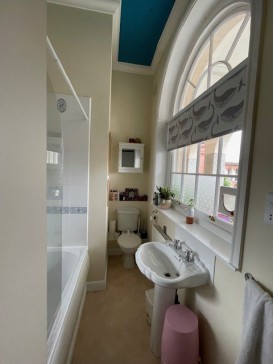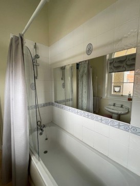 There is a large double bedroom with an ensuite bathroom, and a small box room currently set up as a baby room with a cot. Plus a large bathroom with shower and bathtub.
