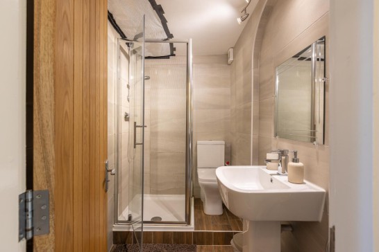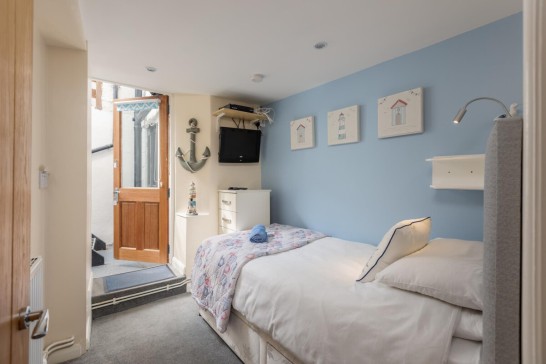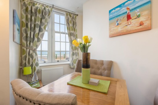 GROUND FLOOR: Entrance: Shared lobby. Four steps lead up to the hallway. Lounge/Kitchen/Diner: Down four steps. comfy sofa with separate chair. TV with Freeview, Now TV and DVD, Amazon Echo Alexa Music Platform, oak dining table and chairs, close sea views from both front windows. Fridge with an icebox, electric cooker with oven and grill, microwave, magimix nesspresso coffee machine (please bring your own supplies). kettle and Toaster. Bedroom 1: Double bed, fitted wardrobe, dressing table, bedside shelves, TV. Bedroom 2: Single bed, TV, Sofa Bed for 2. door leading up to the back patio, wardrobe in the hallway. Tallboy unit in the Bedroom. Bathroom: Shower, toilet and washbasin. Outhouse: Washing machine and separate dryer.