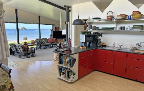 Seasong is an absolute beachfront house in Northland situated in a picturesque horseshoe bay with superb and uninterrupted sea views of the offshore islands and reefs. The comfortable and practical family beach house was designed and built by the owner 15 years ago and reflects his artistic talent and eye for aesthetics.