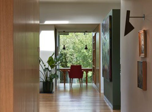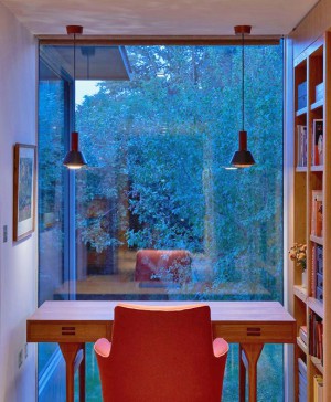 Mid-century furniture and lighting complement the modernist style of the architecture.