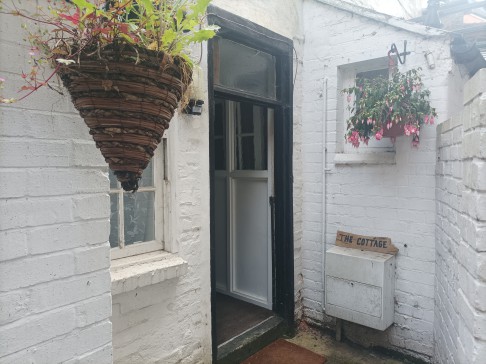 Access to the property is via a passage through a gate on to the street and is behind an estate agent shop/office and photographer's shop at the front.