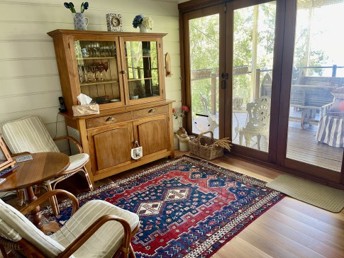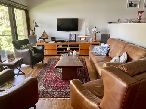 We have an open living area with a small sitting area off the kitchen, then through a doorway into a dining area and lounge. This whole area has floor to ceiling glass windows to take in the lake views. The lounge has reverse cycle air-conditioning.