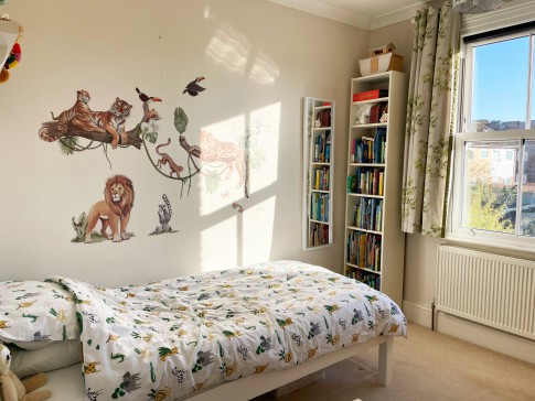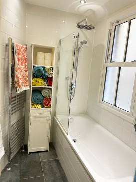 A light and bright family house in Wimbledon, in South-West London. On the first floor there is a double bedroom, two single bedrooms, and a bathroom with a shower over the bath. In the loft conversion there is another double bedroom and a shower room.