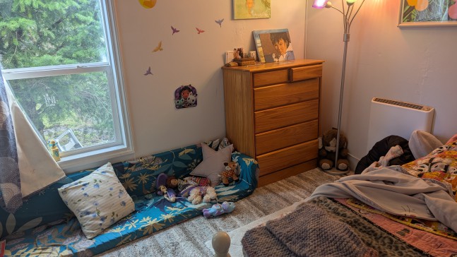 A nice spacious yet cozy home with an open living/dining room. Fruit trees and space to play in the yard. Walk or bike to the beach which is less than a mile away. Views of the Olympic mountains from the expansive front deck. Very calm!
