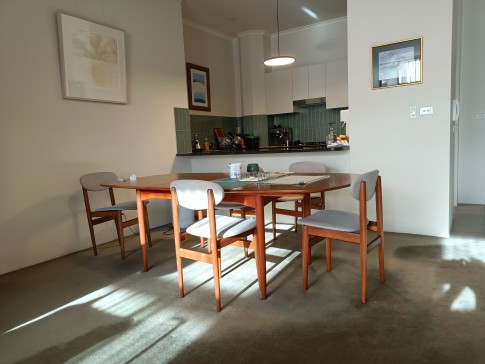 Prior to its conversion to a 30-apartment residence the building was originally an ice-cream factory and warehouse. The apartment is on the top floor (level 3 of a 3-level building), accessible by lift and stairs. The main living area includes the kitchen, a dining area and a lounge/sitting area. The kitchen includes a gas hob, electric stove, refrigerator, microwave, dishwasher, and coffee machine. Everything needed for home-cooking is on hand. There is a spacious dining area that seats six and the lounge area includes a smart TV and stereo system. The main room, the bedroom and the study all have reverse-cycle air-conditioning, high ceilings, large windows/doors opening out onto a balcony looking north east towards Sydney Uni and a major teaching hospital. There is plenty of storage. The study is equipped with a desk and printer. It could be used as a second bedroom if you prefer. There is an additional smart TV in the bedroom, which contains a very comfortable queen-sized bed. There is a stand-alone laundry and a recently-renovated bathroom containing both bath and shower. Linen and towels are provided.